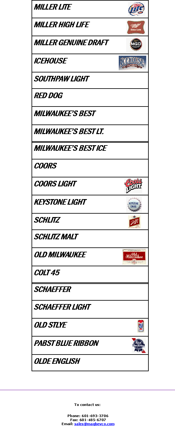 Home PageCompany HistoryDomestic BeerMicros BrewsImportsFlavor Malt BeverageWinesNon- AlcoholicSoda & Water